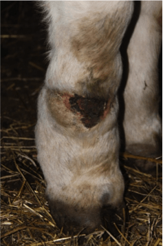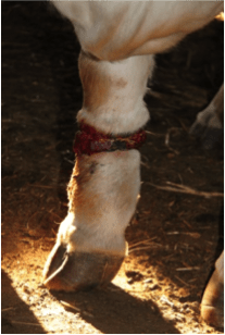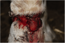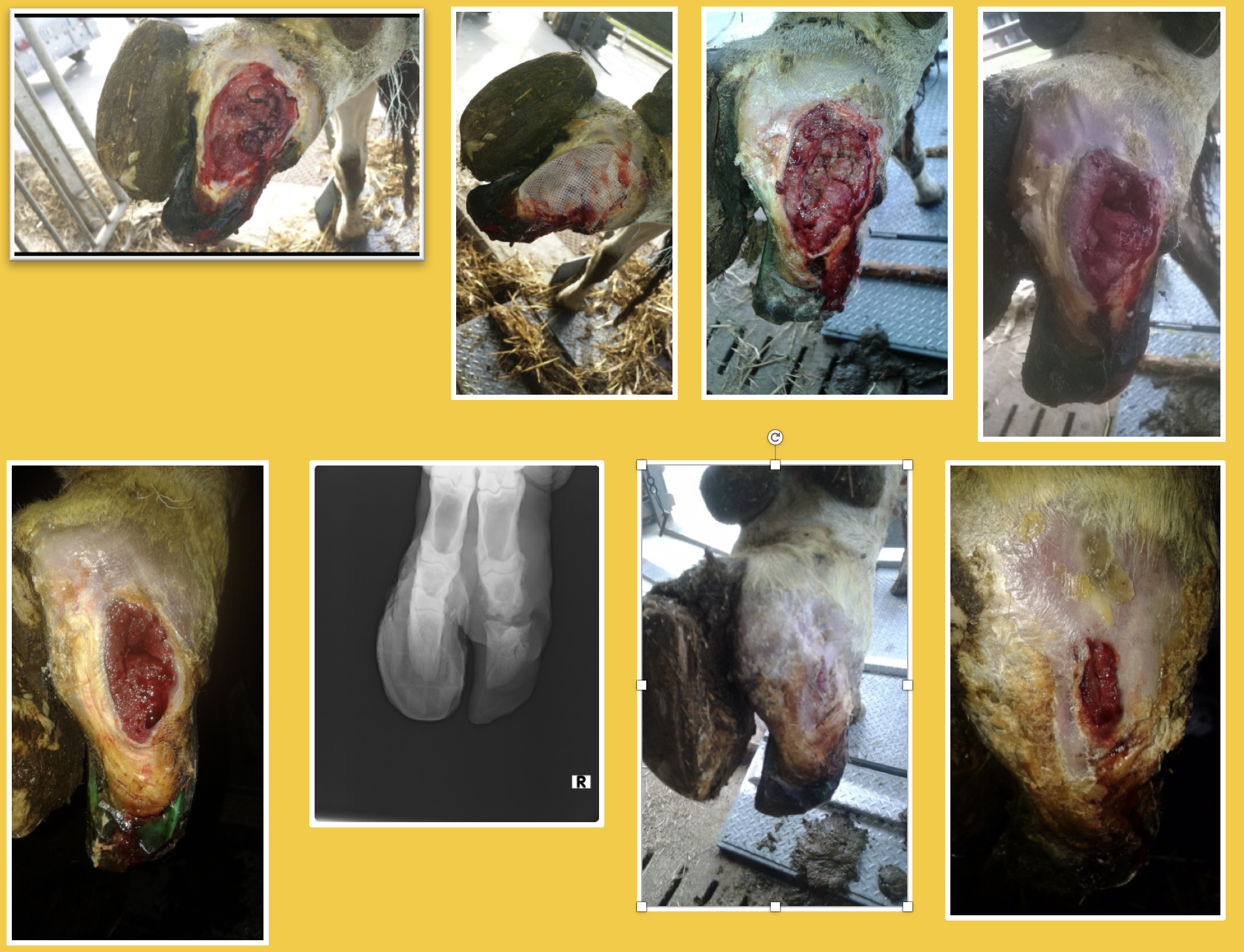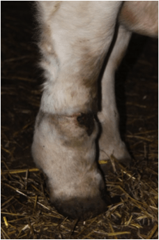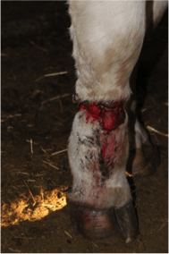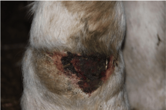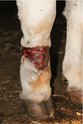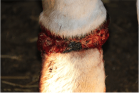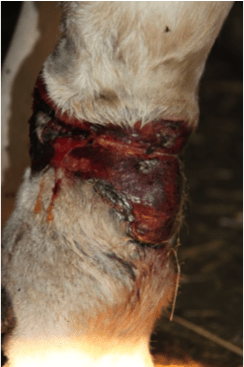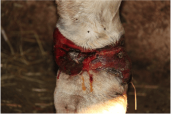 Descrizione: Il soggetto presentava una lesione profonda, con eccessiva presenza di tessuto di granulazione, all'altezza del metacarpo dell'arto anteriore destro conseguente a impastoiamento. Inizialmente, dopo la rimozione della corda, che aveva leso i tessuti sino all'altezza dell'osso del metacarpo, la ferita era stata trattata dall'allevatore solamente con spray a base di nitrato d'argento, senza ottenere risultati positivi.