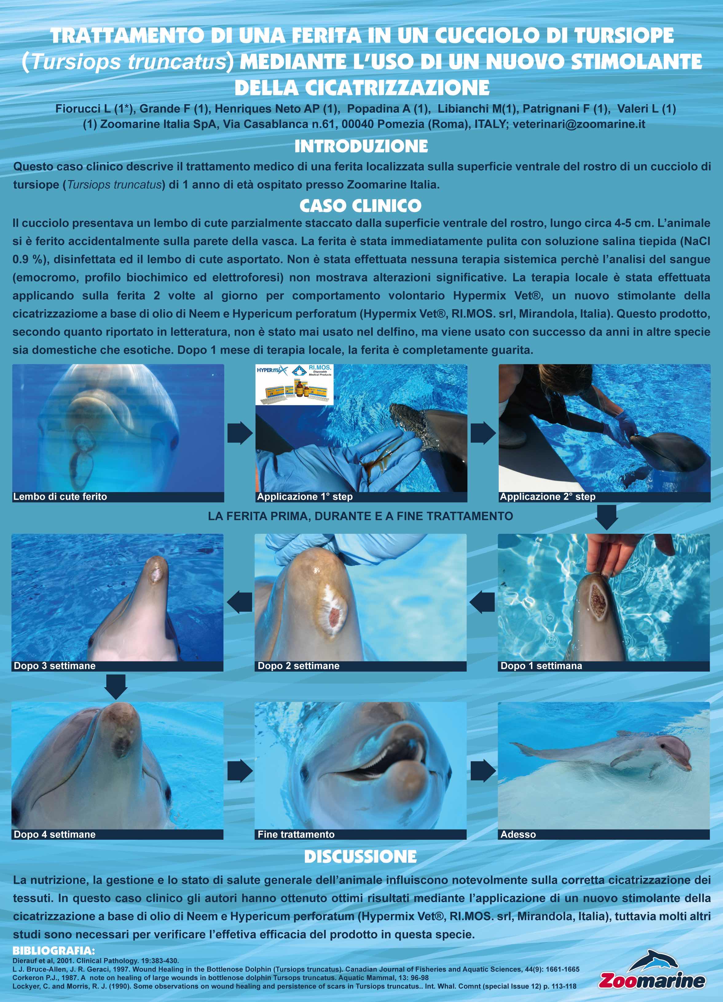 Descrizione: ferita localizzata sulla superficie ventrale del rostro di un cucciolo di tursiope di 1 anno di età, ospitato presso Zoomarine Italia. Il cucciolo presentava un lembo di cute parzialmente staccato dalla superficie ventrale del rostro, lungo circa 4-5 cm. L'animale si è ferito accidentalmente sulla parete della vasca. La ferita è stata immediatamente pulita con soluzione salina tiepida, disinfettata ed il lembo di cute asportato. Non è stata effettuata nessuna terapia sistemica perché l'analisi del sangue non mostrava alterazioni significative. La terapia locale è stata effettuata applicando Hypermix® in formulazione oleosa.