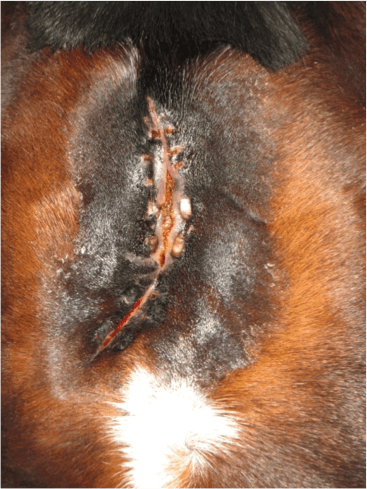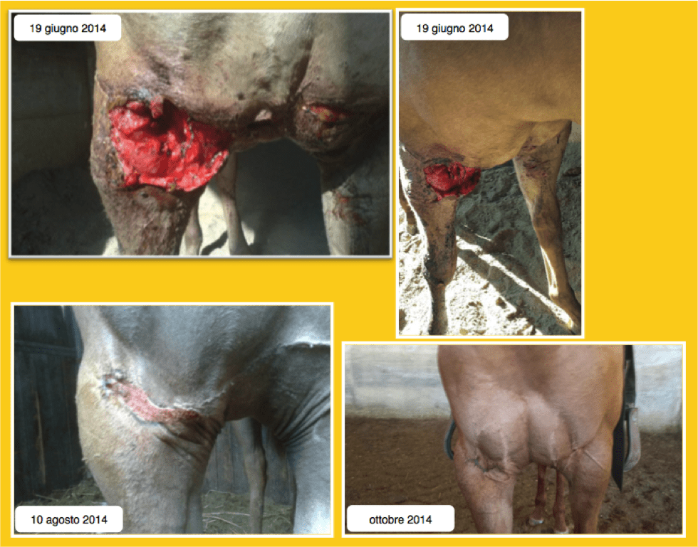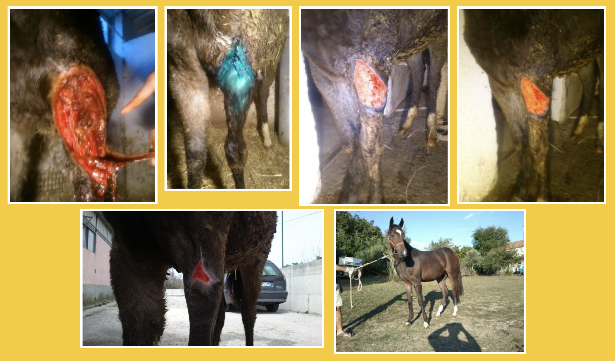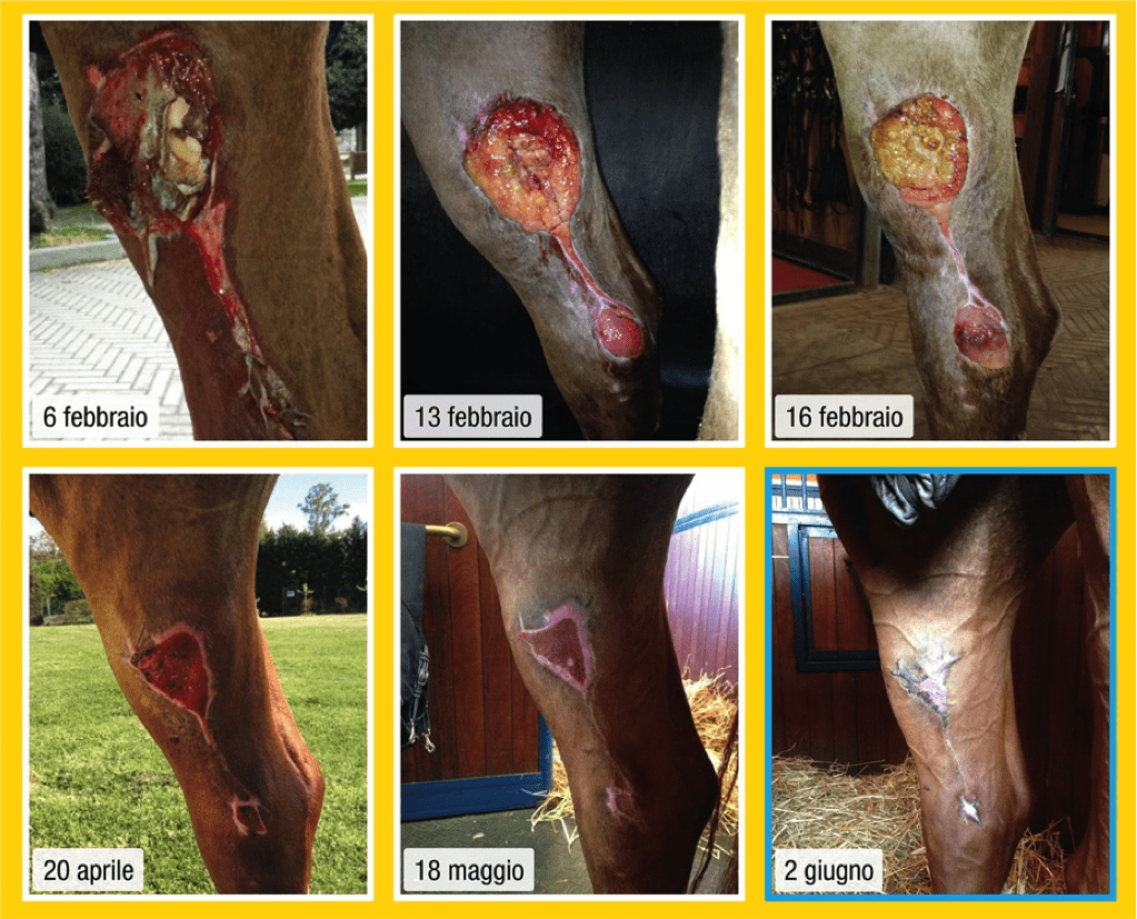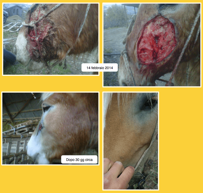 Descrizione: Cavalla Paint Horse, femmina, feritasi accidentalmente al petto con un tondino di ferro sporgente del recinto in cui si trovava. Il soggetto presentava un’ampia ferita lacera, con lembo cutaneo pendente, all’altezza del petto, del diametro di circa 20 cm. La lesione era stata trattata inizialmente con nitrato d’argento e i lembi riavvicinati con alcuni punti di sutura, rimosso dopo qualche giorno per il formarsi di una sacca purulenta. La completa risoluzione della lesione si è avuta in circa 45 giorni