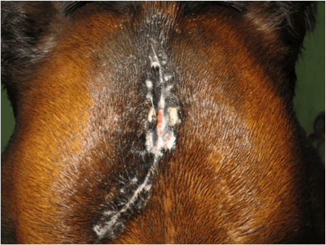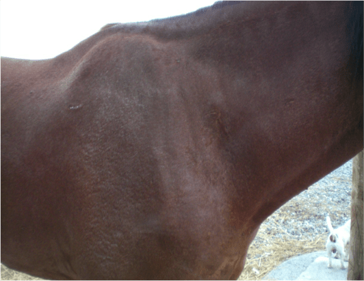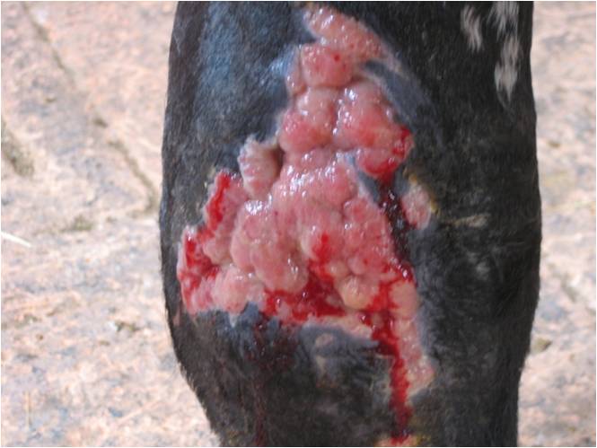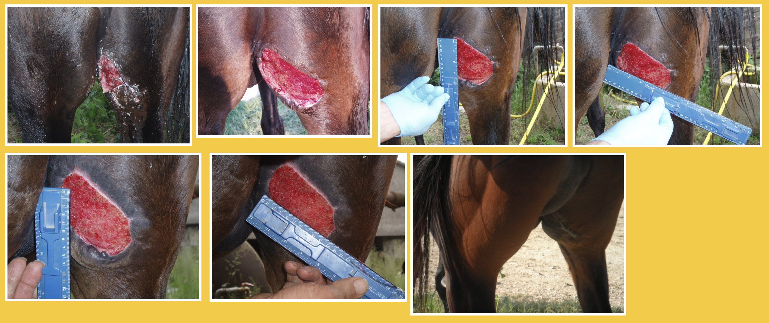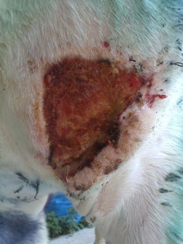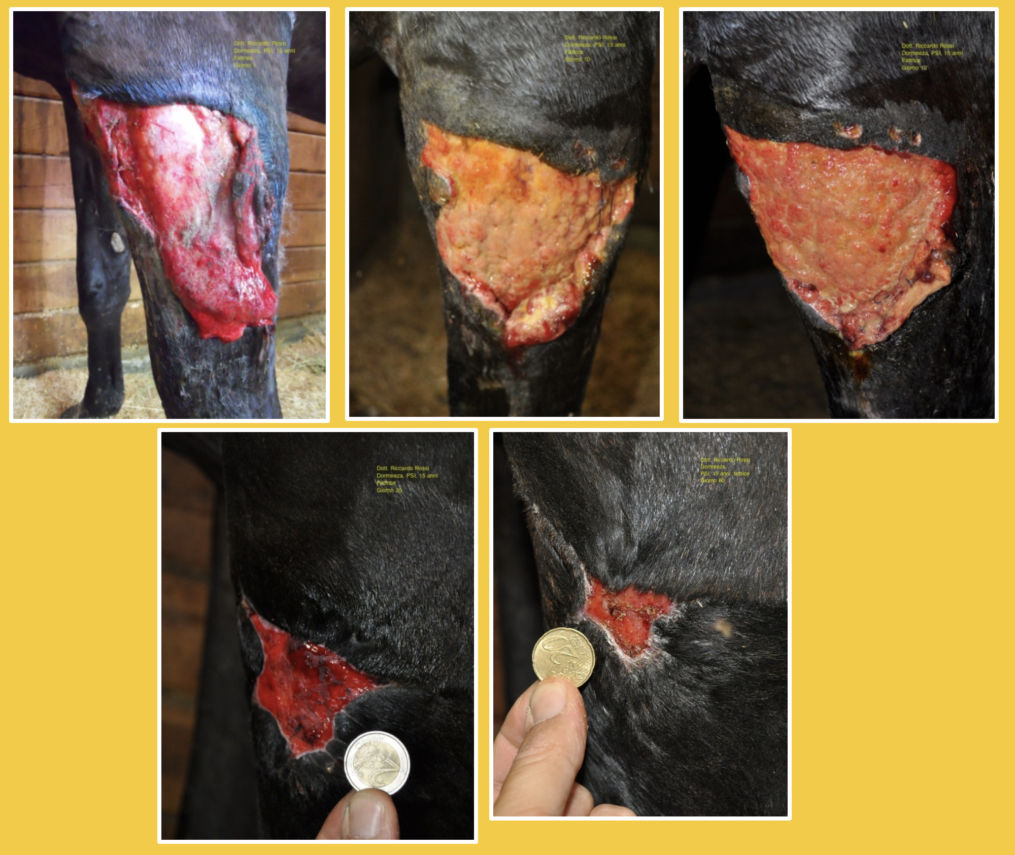 Descrizione: Cavalla Paint Horse, femmina, feritasi accidentalmente al petto con un tondino di ferro sporgente del recinto in cui si trovava. Il soggetto presentava un’ampia ferita lacera, con lembo cutaneo pendente, all’altezza del petto, del diametro di circa 20 cm. La lesione era stata trattata inizialmente con nitrato d’argento e i lembi riavvicinati con alcuni punti di sutura, rimosso dopo qualche giorno per il formarsi di una sacca purulenta. La completa risoluzione della lesione si è avuta in circa 45 giorni