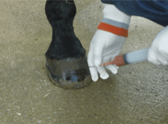 APPLICARE, tramite pennello, un leggero strato lungo la muraglia, dalla corona sino alla punta, passando per suola, fettone e glomi, aiuterà a creare un ambiente protetto riducendo le possibilità che la patologia tarlo si manifesti in quanto l'azione biocida sarà enfatizzata.