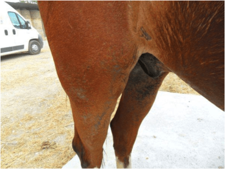 Descrizione: il cavallo è stato castrato, successivamente operato per una lesione al peritoneo, e poi dimesso dopo 15 giorni di degenza. Successivamente alle dimissioni, si è iniziato ad applicare Hypermix® formulazione gel e soluzione fisiologica due volte al giorno.
