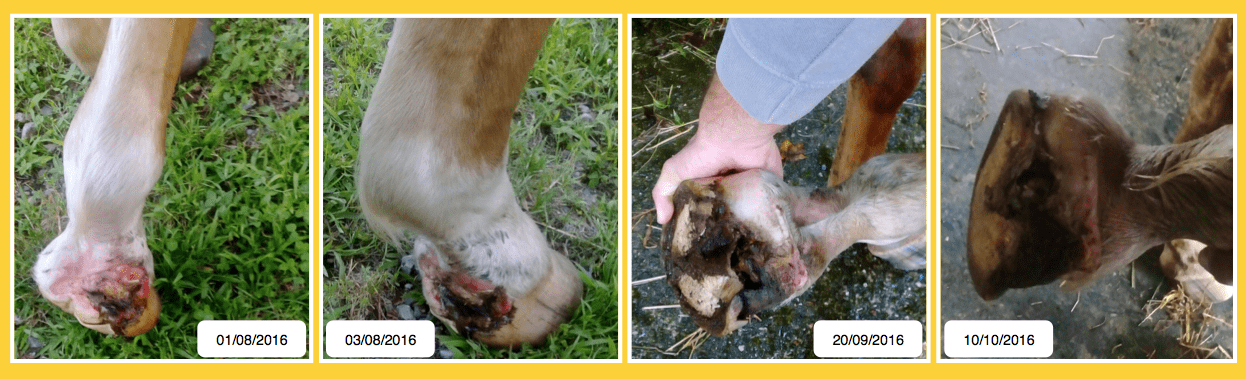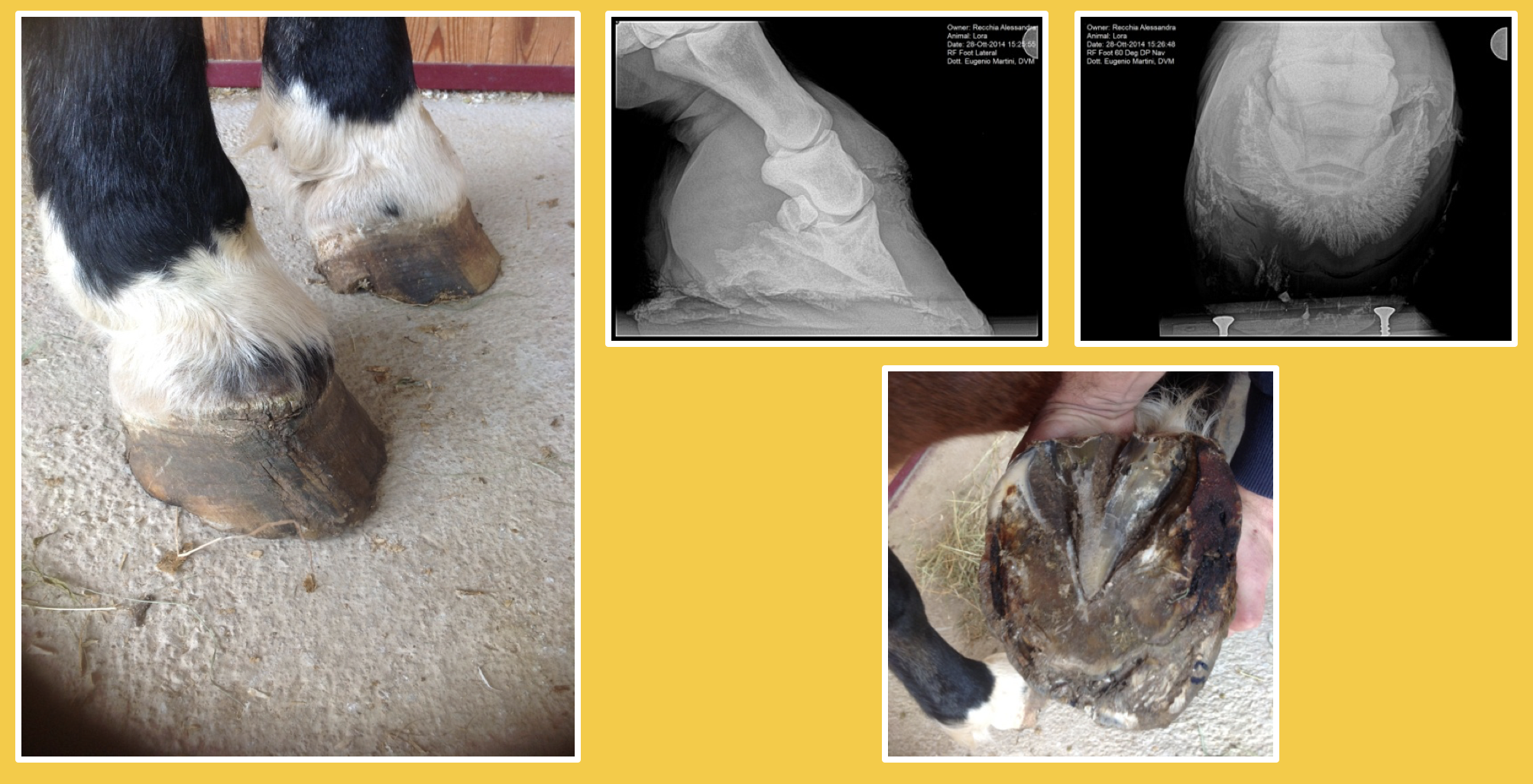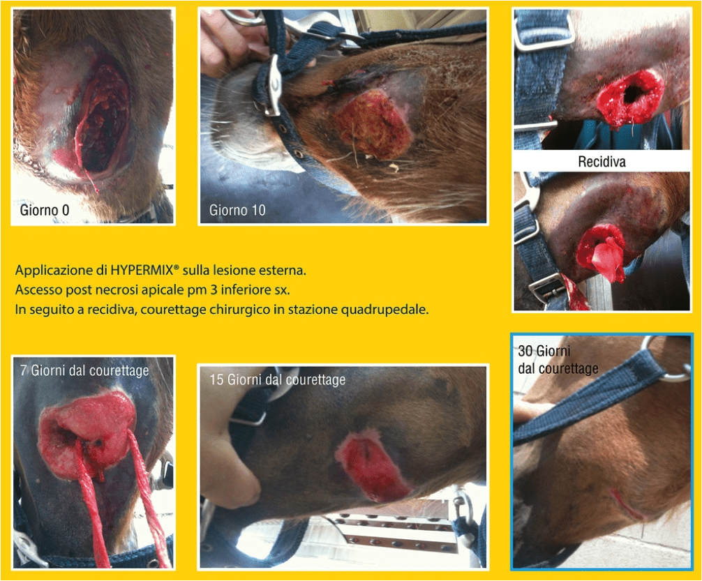 Descrizione: Si tratta di un cavallo TPR, femmina di 7 anni che presentava zoppia e spurgo in corona da circa 12 mesi e che in precedenza era stato trattato, senza successo, da un collega con antibiotici per via generale. Dopo il ricovero presso la nostra struttura è stata eseguita la visita clinica e l'esame radiografico. Si è provveduto ad effettuare una anestesia perineurale e ad applicare un laccio emostatico. Con una saga da osso è stata tagliata la parete del piede in corrispondenza della deformità ed è stata asportata la parte interessata. Prima dell'asportazione della parete è stato applicato un ferro con 3 barbette e con supporto per il fettone. Dopo l'intervento la parte è stata medicata e fasciata. Il soggetto non manifestava alcuna zoppia già al terzo giorno dopo l'intervento il trattamento con Hypermix® è durato circa 30 giorni, abbiamo usato sia le garze medicate che la formulazione oleosa. Si applicava, nell'ordine, il liquido, poi la garza grassa di Hypermix®, poi una garza sterile, una cotonina e una fascia elastica Vetrap.