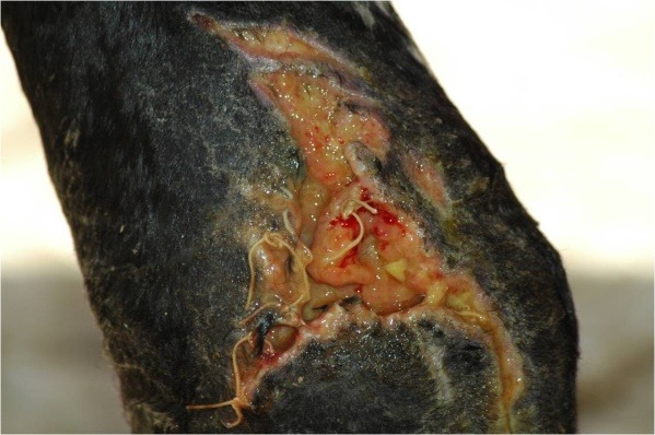 Le ferite traumatiche da morso possono facilmente essere infestate da larve di mosca (miasi).