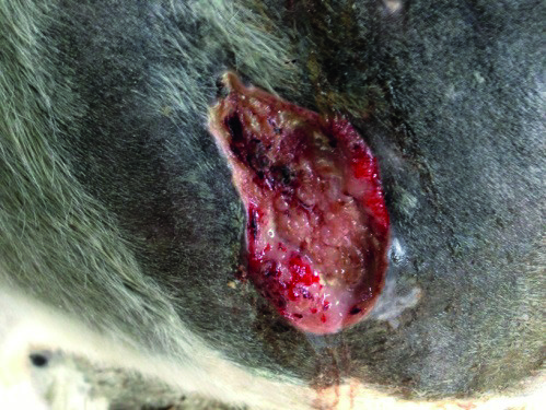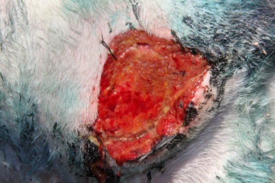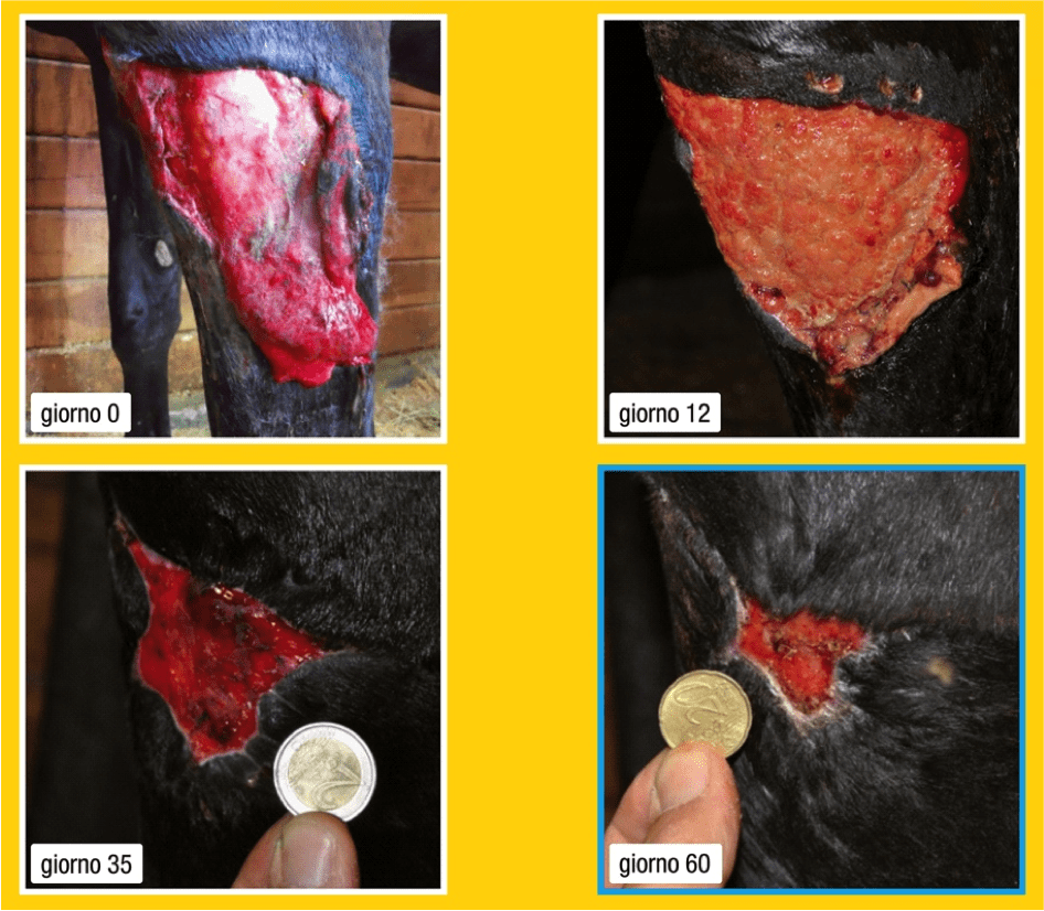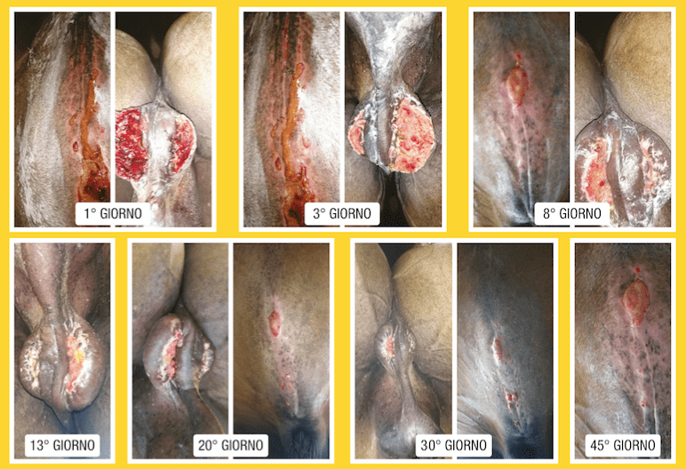 Modalità di applicazione: si è lavata la ferita con ringer lattato una volta al dì, medicato con Hypermix® formulazione oleosa e fasciato. Solo nei primi giorni, si sono utilizzate delle spugne in poliuretano per assorbire l'essudato.