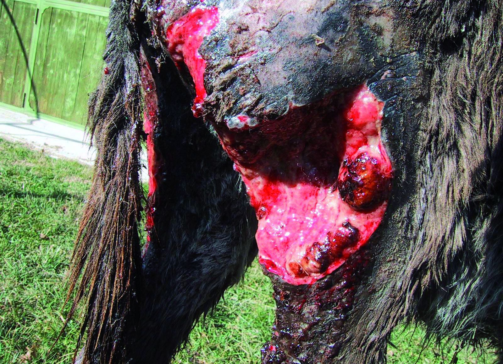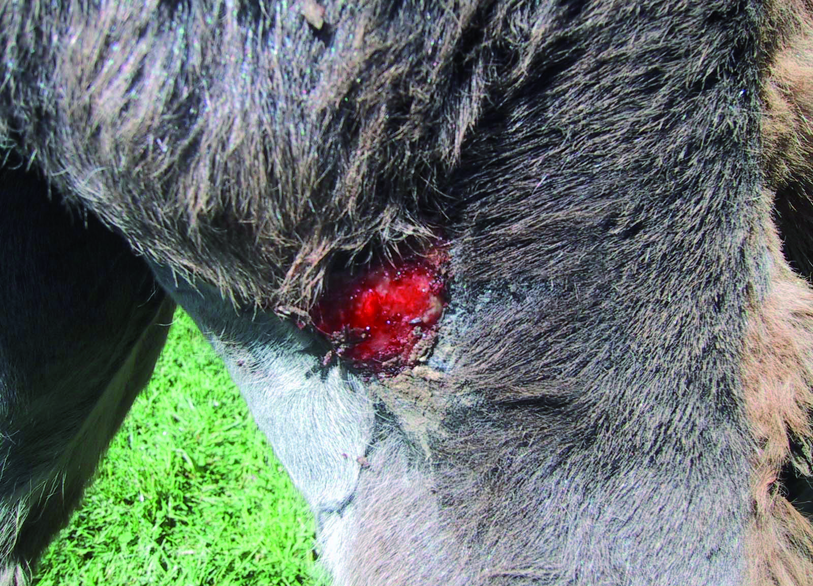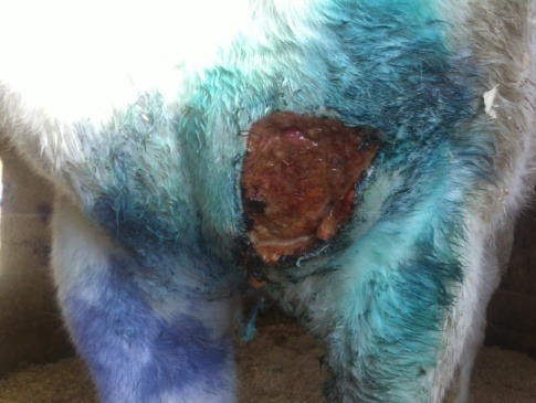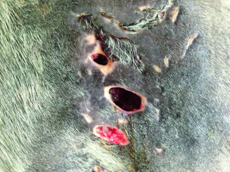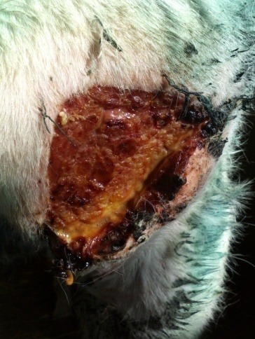Descrizione: Il soggetto è stato ricoverato con lesioni plurime in seguito ad attacco da parte dello stallone. Dopo pulizia chirurgica e terapia antibiotica si procede con medicazione giornaliera di HYPERMIX® GEL associato a HYPERMIX® GARZE. La prassi prevede lavaggio delle ferite con fisiologica, asportazione delle parti necrotiche, applicazione del prodotto e vaselina filante attorno. Si evidenzia una rapida formazione di tessuto di granulazione e riepitelizzazione delle lesioni e assenza di infezione. L’asina guarisce rapidamente, ma rimane un tragitto fistoloso che origina da infezione di una costola fratturata.