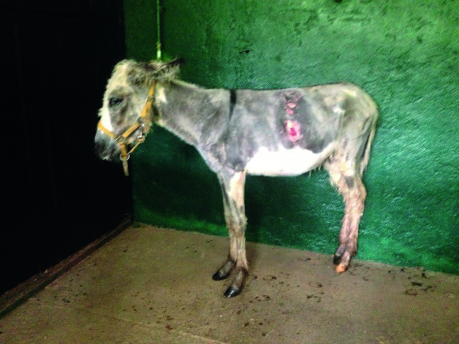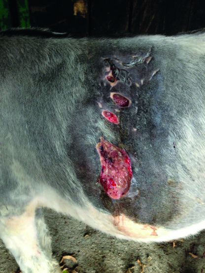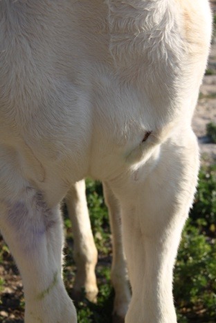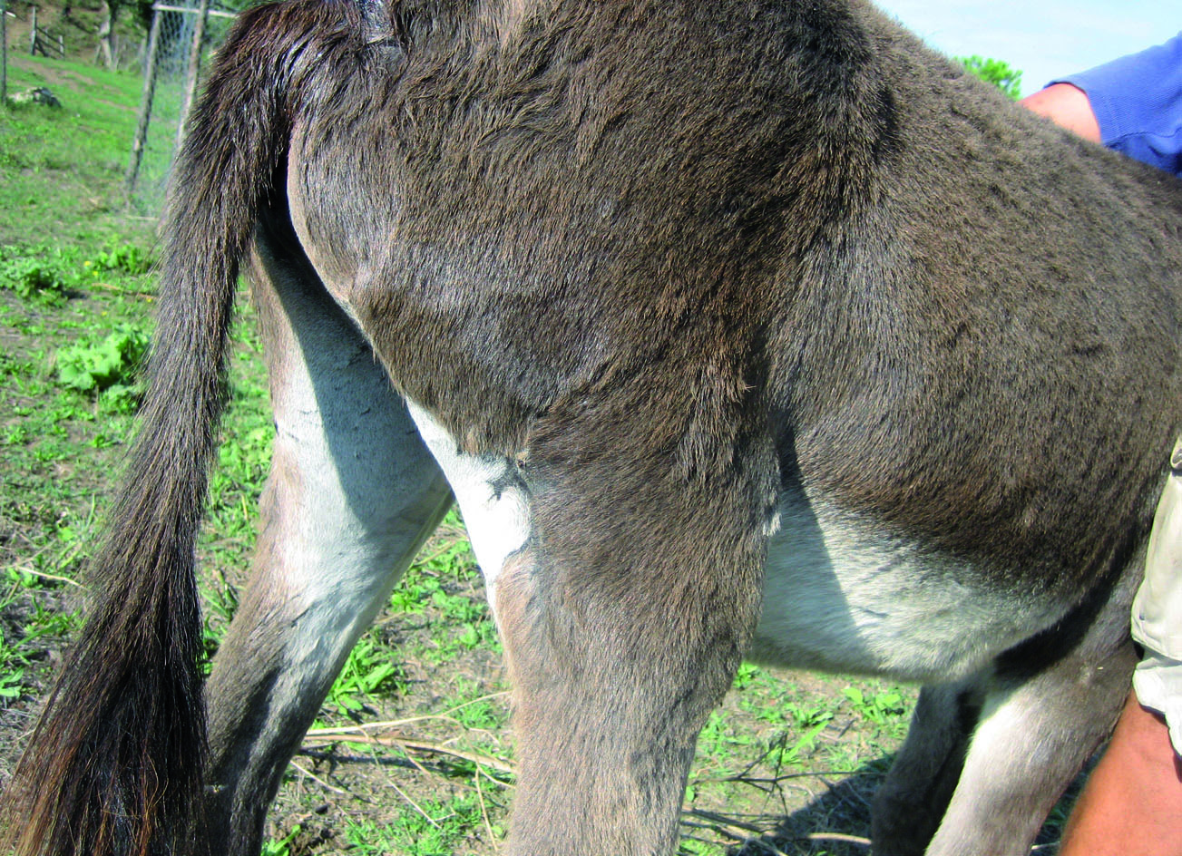 Descrizione: Lesioni lacero-contuse da morso al treno posteriore in asino di 6 mesi. Compromissione della massa muscolare