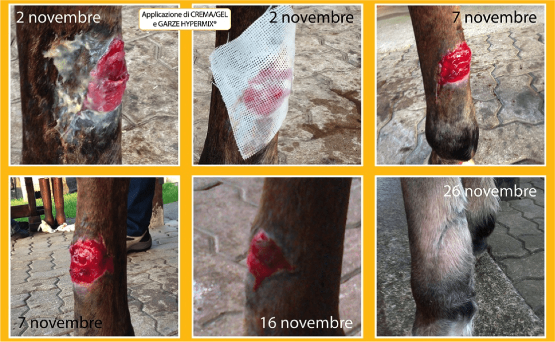 Descrizione: La ferita risultava sporca, con un tessuto di granulazione esuberante e con una lesione profonda del glomo laterale dell'arto anteriore destro. Dopo aver effettutato il curettage chirurgico della ferita ed un abbondante lavaggio con soluzione fisiologica, si è provveduto all'applicazione di garze Hypermix® mantenute ""in situ"" mediante l'utilizzo di una fasciatura protettiva. In associazione si prescriveva terapia sistemica con antibiotico ed antinfiammatorio per 7 giorni. Regolarmente e per 7 giorni consecutivi si è provveduto ad effettuare il lavaggio con soluzione fisiologica, l'applicazione delle Garze Hypermix® ed il cambio della fasciatura. Al termine della terapia sistemica si è continuato con l'applicazione di Hypermix® gel, previa pulizia con garze asciutte della parte interessata fino alla cicatrizzazione, per seconda intenzione, della ferita. In 60 giorni la ferita si è risolta senza lasciare alcuna traccia, come da documentazione fotografica allegata. Prodotto utilizzato: Hypermix® garze, Hypermix® gel.