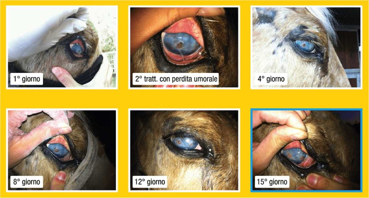 Modalità di applicazione: la cavalla, cieca dall'occhio destro per uveite recidivante periodica (mal della luna), presentava due grosse ulcere corneali, una delle quali perforata con fuoriuscita di umor acqueo. Trattata con una goccia di Hypermix® formulazione oleosa al giorno. La cavalla manifestava bruciore alla somministrazione dell'olio, ma in pochi giorni i capillari della periferia si sono diretti sulle lesioni corneali determinandone la riparazione. Decorso: l'occhio ha sviluppato phthisis bulbi a causa dei gravi danni pregressi a carico dell'uvea.