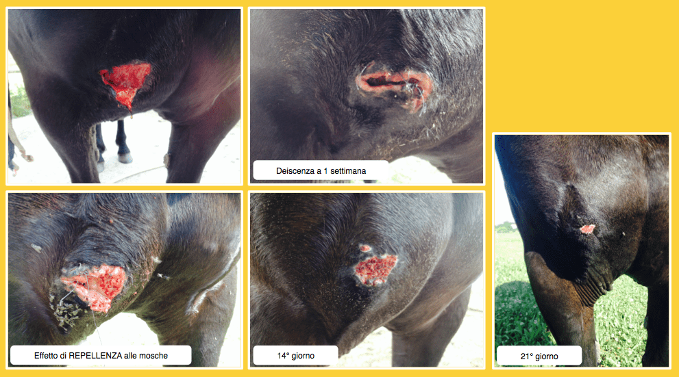 Modalità di applicazione: ferita al petto suturata, dopo 7 gg deiscenza trattata con Hypermix® formulazione oleosa, 1 volta al dì. DA NOTARE: l'effetto di repellenza alle mosche.
