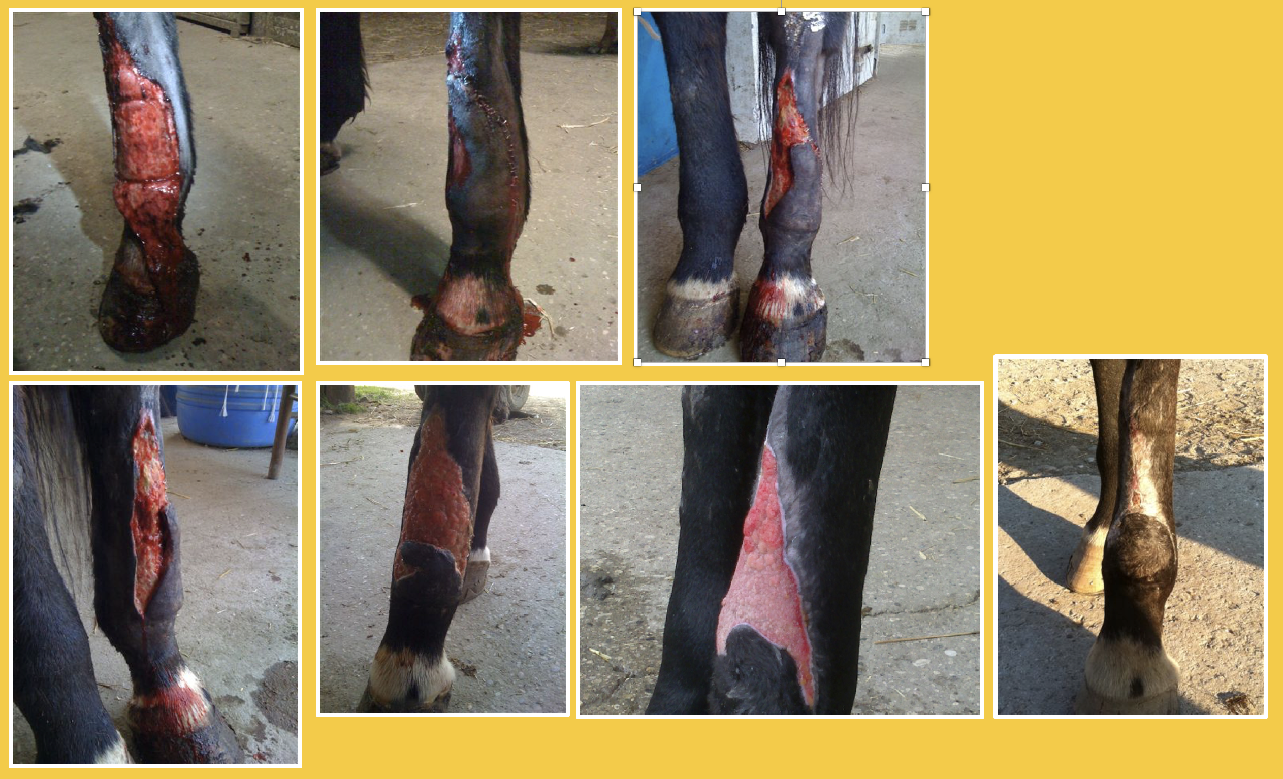 Descrizione: Il soggetto presentava una ferita lacera abbastanza estesa con lembo cutaneo pendente, all'altezza della coscia sinistra. Il giorno seguente l'intervento il puledro si è morso strappandosi parte della sutura cutanea (circa la metà dal basso verso l'alto) della porzione medio-laterale del braccio. Le suture profonde, al contrario, hanno retto all'auto-traumatismo. Dopo 7 giorni, in sede di controllo il tessuto necrotico è stato rimosso, comprese le parti sempre necrotiche di pertinenza muscolare, lacinie di tessuto non ben compresse in sutura e dunque morte. È stato fatto un curettage molto leggero. Da questo punto in poi si è iniziato l'utilizzo di Hypermix®. La completa guarigione si è ottenuta in circa 70 giorni a causa del danno, e per l'età giovane del soggetto.